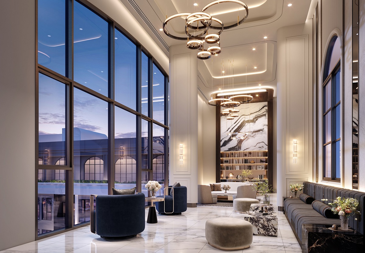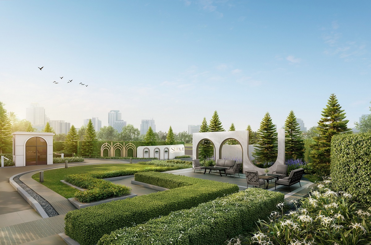การออกแบบอาคารเน้นความยอดนิยม ดูดี มีรายละเอียดแบบ Modern Classic ผสมผสานเส้นสายที่สมดุลเข้ากับองค์ประกอบสไตล์หรูหรา อาทิ ซุ้มโค้ง ช่องแสงขนาดใหญ่ และรายละเอียดตกแต่งอย่างบัวผนัง และพื้นผิววัสดุในโทนสีสุภาพเรียบหรู เพื่อให้สอดคล้องกับแบรนด์และภาพลักษณ์ของผู้อยู่อาศัย