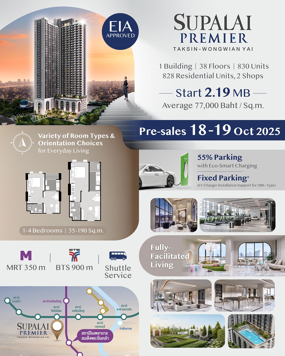 หลังปิดการขาย “ศุภาลัย เอลีท สุขุมวิท 39” อย่างรวดเร็วทันทีที่เปิดตัวเมื่อเดือนสิงหาคมที่ผ่านมา ล่าสุด บมจ.ศุภาลัย ไม่หยุดเดินเกม ส่งไม้ต่อด้วย “ศุภาลัย พรีเมียร์ ตากสิน–วงเวียนใหญ่” คอนโดมิเนียมใหม่บนทำเลศักยภาพฝั่งธนบุรี วางหมากบนทำเลเชื่อมโครงข่ายคมนาคมเหนือ–ใต้ และตะวันออก–ตะวันตก พร้อมจับจังหวะเสร็จทันรถไฟฟ้า MRT สายสีม่วงใต้ปี 2572 เจาะตลาดคอนโดฯ ระดับกลางบนที่ซัพพลายจำกัด ชูจุดขายราคาเริ่มต้น 2.19-18 ล้านบาท สร้างมูลค่าเพิ่มทั้งการอยู่อาศัยและโอกาสลงทุน และโครงการได้ผ่านการพิจารณาการประเมินผลกระทบสิ่งแวดล้อม (EIA) เรียบร้อยแล้ว