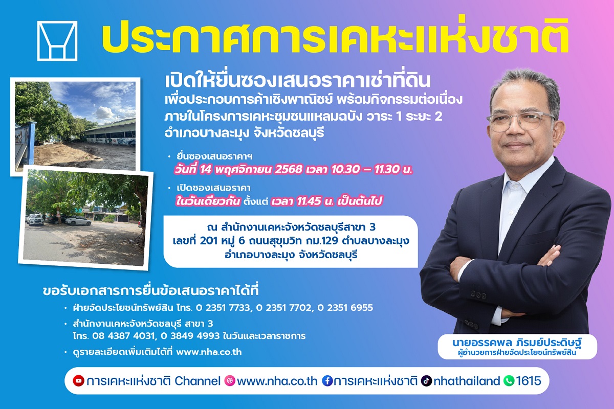 การเคหะแห่งชาติ เปิดโอกาสให้ผู้ประกอบการเช่าพื้นที่ระยะยาว 15 ปี เพื่อประกอบการค้าเชิงพาณิชย์ ภายในโครงการเคหะชุมชนแหลมฉบัง วาระ 1 ระยะ 2 ถนนเมืองใหม่ใต้ (แยกจากถนนสุขุมวิท กล.3) ตำบลบางละมุง อำเภอบางละมุง จังหวัดชลบุรี เมื่อวันที่ 16 ตุลาคม 2568 นายอรรคพล ภิรมย์ประดิษฐ์ ผู้อำนวยการฝ่ายจัดประโยชน์ทรัพย์สิน กล่าวว่า การเคหะแห่งชาติเปิดให้เอกชนยื่นซองเสนอราคาค่าธรรมเนียมการได้สิทธิเช่าที่ดิน เพื่อประกอบการค้าเชิงพาณิชย์ พร้อมกิจกรรมต่อเนื่อง บนที่ดินโฉนดเลขที่ 231198 เนื้อที่ประมาณ 9-0-44.6 ไร่ เพื่อให้เกิดความโปร่งใสในการดำเนินงานทุกขั้นตอนตามหลักธรรมาภิบาล การเคหะแห่งชาติจึงเปิดโอกาสให้เอกชนที่สนใจสามารถยื่นข้อเสนอราคา โดยมีอัตราค่าธรรมเนียมการได้สิทธิเช่าขั้นต่ำไม่น้อยกว่า 2,200,000 บาท ระยะเวลาเช่า 15 ปี ในอัตราค่าเช่ารายเดือน ปีที่ 1–3 เดือนละ 64,600 บาท ปีที่ 4–6 เดือนละ 72,000 บาท ปีที่ 7–9 เดือนละ 80,000 บาท ปีที่ 10–12 เดือนละ 88,000 บาท และปีที่ 13–15 เดือนละ 97,000 บาท