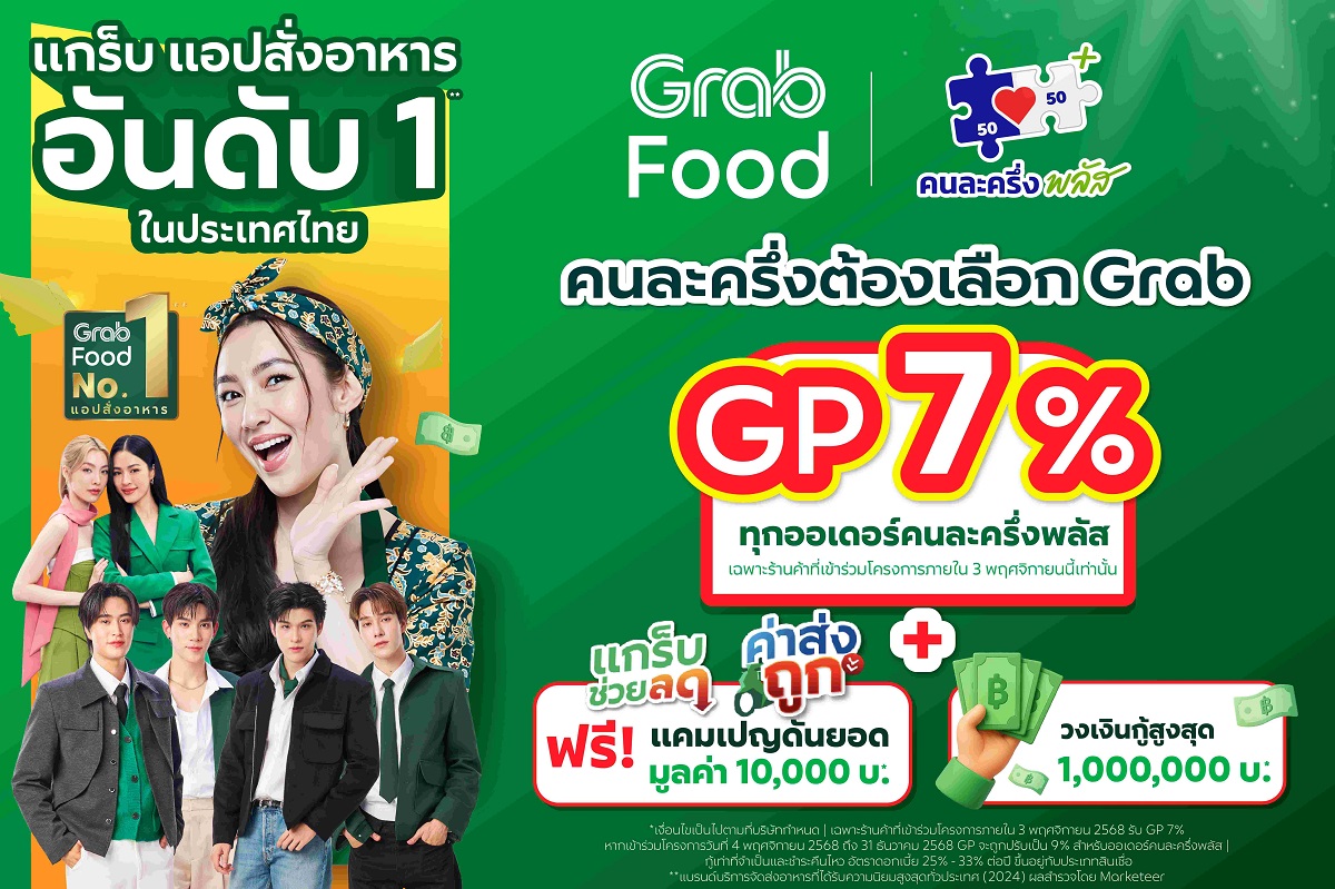 แกร็บ แอปสั่งอาหารอันดับ 1* ในประเทศไทย ขานรับนโยบาย “Quick Big Win” ของทางภาครัฐฯ เร่งกระตุ้นเศรษฐกิจผ่านโครงการ “คนละครึ่งพลัส” ด้วยบริการฟู้ดเดลิเวอรี หวังกระตุ้นการจับจ่ายและแบ่งเบาค่าครองชีพผู้บริโภคในช่วงปลายปี พร้อมกระจายรายได้และหนุนผู้ประกอบการร้านอาหาร งัดแคมเปญ “GrabFood X คนละครึ่งพลัส ดันยอดโตสูงสุด 9 เด้ง” จัดเต็มสิทธิประโยชน์ถึง 9 ต่อตลอดโครงการ ชูไฮไลต์หั่นค่าคอมมิชชันเหลือ 7%** สำหรับร้านที่สมัครเข้าร่วมโครงการฯ ในวันแรก (3 พฤศจิกายน 2568) เสริมทัพด้วยโปรแกรมดันยอดขาย-ส่วนลดพิเศษจากแกร็บมูลค่าสูงสุด 10,000 บาท** พ่วงให้สินเชื่อสำหรับร้านที่เข้าร่วมโครงการฯ ด้วยวงเงินสูงสุดถึง 1 ล้านบาท*** พร้อมทุ่มงบกว่า 200 ล้านบาทลุยโปรโมตแคมเปญทั่วประเทศ