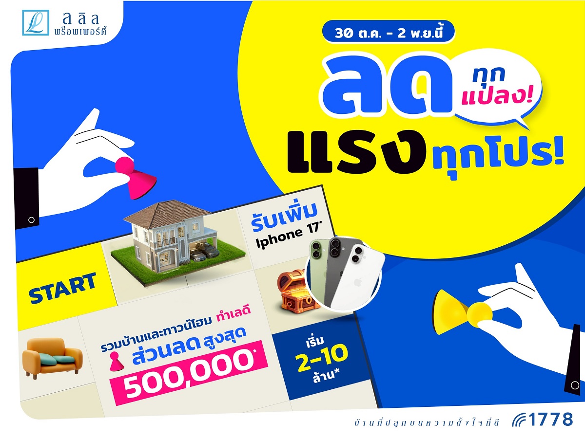 สำหรับผู้ที่กำลังมองหาบ้านคุณภาพ ลลิล พร็อพเพอร์ตี้ พร้อมมอบข้อเสนอพิเศษภายในงาน “มหกรรมบ้านและคอนโด ครั้งที่ 48” ระหว่าง 30 ตุลาคม – 2 พฤศจิกายน 2568 ณ ศูนย์การประชุมแห่งชาติสิริกิติ์ ด้วยส่วนลดสูงสุด 500,000 บาท และรับเพิ่ม iPhone 17 มูลค่า 29,900 บาท สำหรับผู้ที่จองภายในงาน สอบถามรายละเอียดเพิ่มเติม โทร.1778 หรือ www.lalinproperty.com ทั้งนี้เงื่อนไขเป็นไปตามที่บริษัทกำหนด