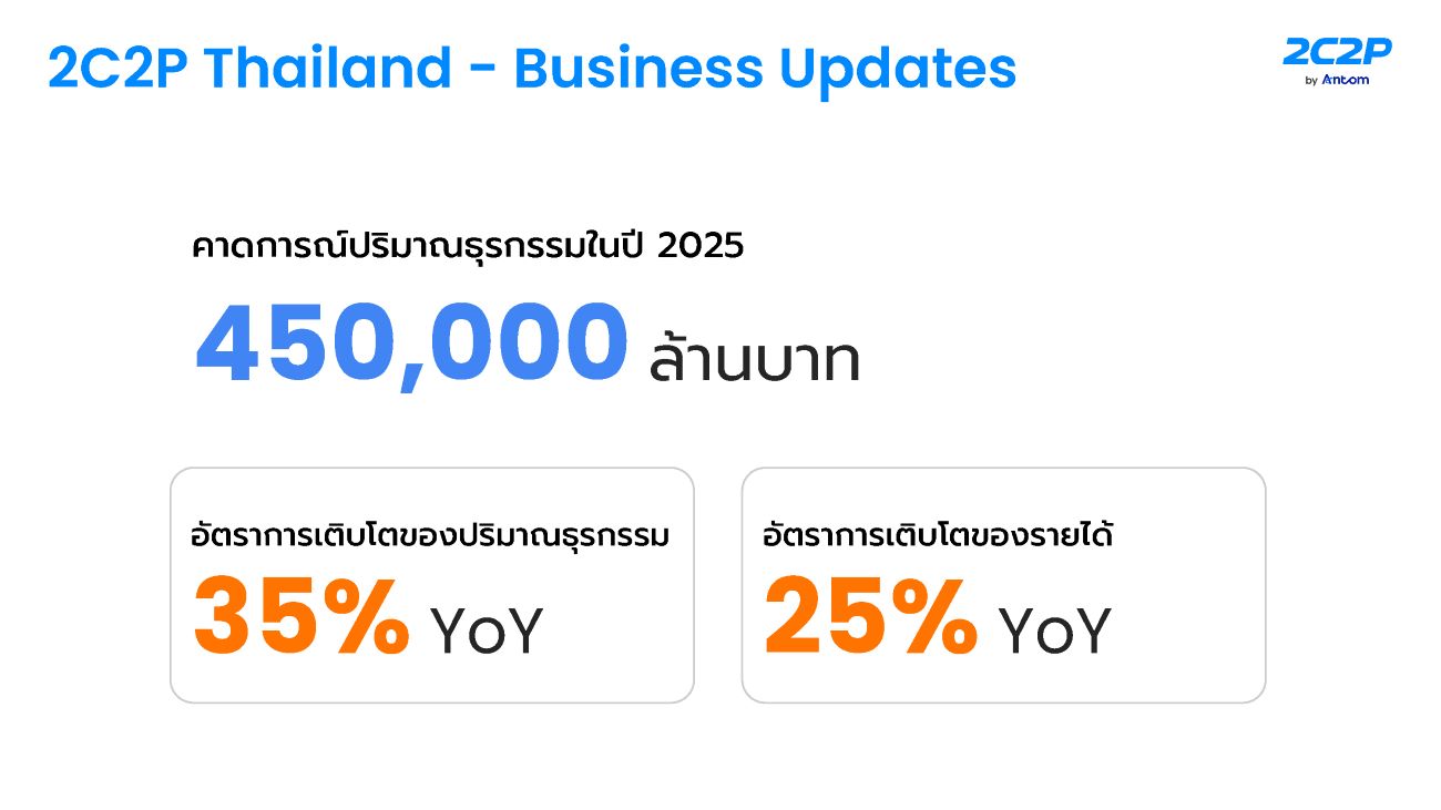 นายวรฉัตร ลักขณาโรจน์ ประธานกรรมการบริหาร บริษัท ทูซีทูพี (ประเทศไทย) จำกัด กล่าวถึงการก้าวสู่การเติบโตครั้งใหม่ของ 2C2P ว่า ในปี 2568 เราคาดว่าปริมาณธุรกรรมรวมของ 2C2P ประเทศไทยจะทะลุ 450,000 ล้านบาท เติบโตขึ้นกว่า 35% จากปีก่อนหน้า ขณะที่รายได้จะเติบโตขึ้นราว 25% ซึ่งสะท้อนถึงความแข็งแกร่งของธุรกิจและความไว้วางใจจากลูกค้าทั้งในและต่างประเทศ