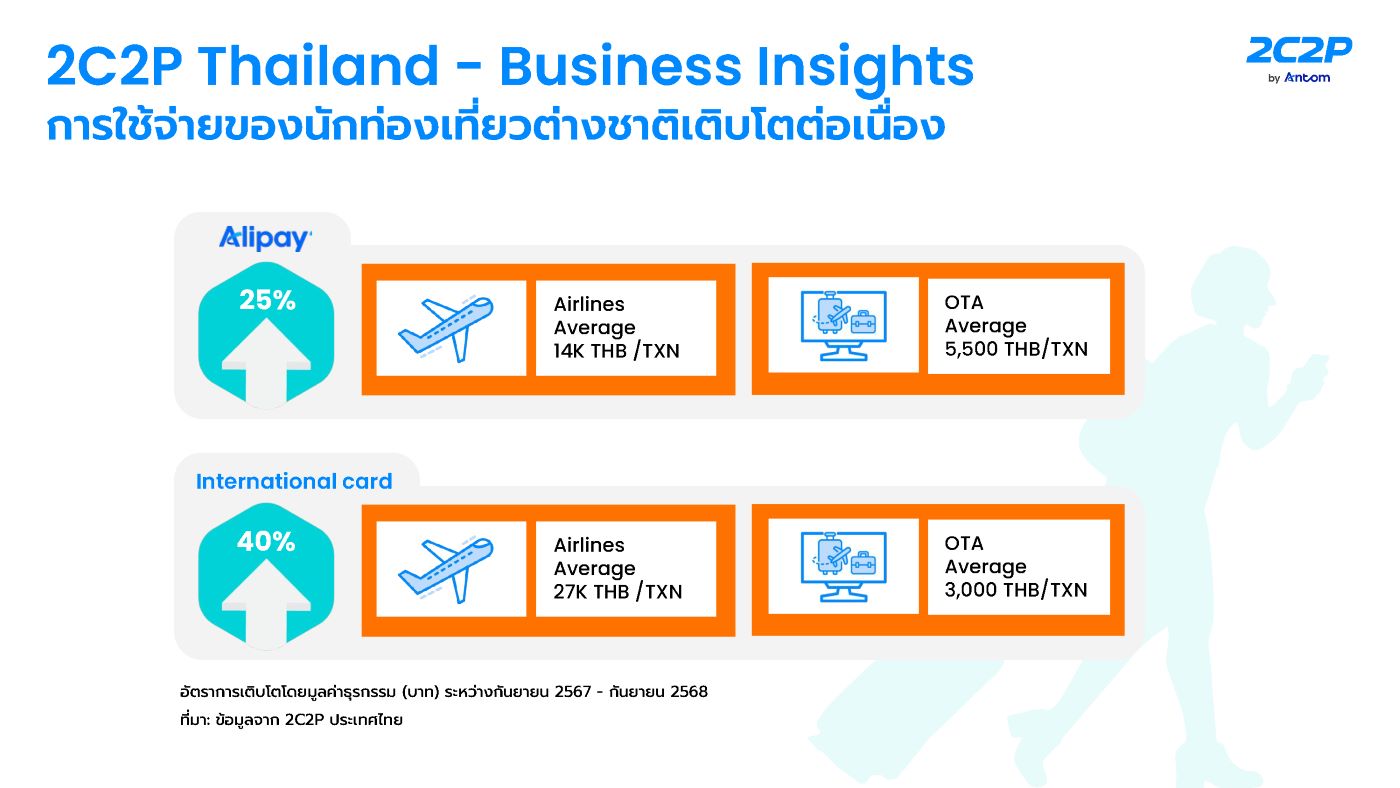 จากรายงานธุรกิจและข้อมูลเชิงลึกของ 2C2P ประเทศไทยยังพบว่า แนวโน้มการใช้จ่ายของนักท่องเที่ยวต่างชาติในไทยยังคงเติบโตอย่างต่อเนื่อง โดยเฉพาะผ่านช่องทางดิจิทัลอย่าง Alipay และ บัตรเครดิตต่างประเทศ ซึ่งสะท้อนถึงความเชื่อมั่นในการใช้จ่ายผ่านระบบชำระเงินที่ปลอดภัยและสะดวกมากขึ้น