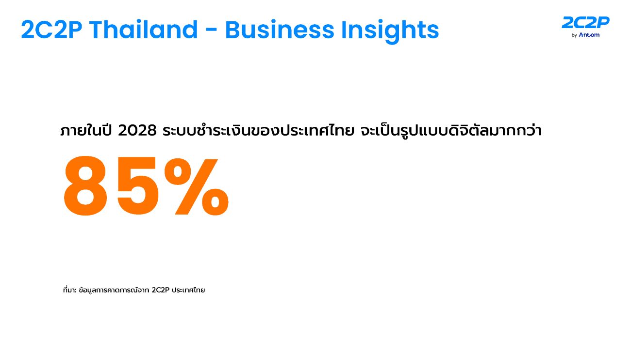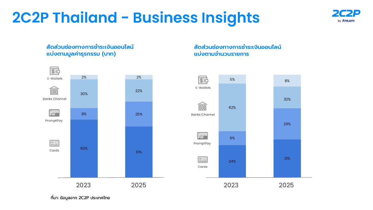 พฤติกรรมการชำระเงินของผู้บริโภคไทยยังคงเปลี่ยนแปลงอย่างต่อเนื่อง โดยมีแนวโน้มว่าช่องทาง PromptPay และ e-Wallets จะเติบโตอย่างมีนัยสำคัญในอีกไม่กี่ปีข้างหน้า ขณะที่บัตรเครดิตและช่องทางธนาคารยังคงครองสัดส่วนมูลค่าธุรกรรมหลัก โดยเฉพาะในหมวดการท่องเที่ยว การเดินทาง และสินค้าพรีเมียม ทั้งนี้ 2C2P คาดการณ์ว่า ภายในปี 2568 ระบบ PromptPay และ e-Wallets จะมีบทบาทสำคัญในเชิงปริมาณธุรกรรม และภายในปี 2571 ระบบการชำระเงินของประเทศไทยจะเปลี่ยนผ่านสู่รูปแบบดิจิทัลมากกว่า 85%