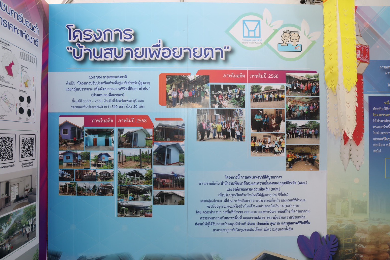 การเคหะแห่งชาตินำเสนอผลงาน “โครงการปรับปรุงหรือสร้างที่อยู่อาศัยสำหรับผู้สูงอายุและกลุ่มเปราะบางเพื่อพัฒนาคุณภาพชีวิตที่ดีอย่างยั่งยืน (บ้านสบายเพื่อยายตา)” ซึ่งดำเนินงานมาตั้งแต่ปี 2553 ที่จังหวัดเพชรบุรี และขยายผลทั่วประเทศกว่า 540 หลัง โดยร่วมมือระหว่างการเคหะแห่งชาติ สำนักงานพัฒนาสังคมและความมั่นคงของมนุษย์จังหวัด (พมจ.) และองค์กรปกครองส่วนท้องถิ่น (อปท.) การเคหะแห่งชาติได้สนับสนุนงบประมาณในรูปแบบเงินบริจาค เพื่อปรับปรุงหรือสร้างบ้านใหม่ให้ผู้สูงอายุ (อายุ 60 ปีขึ้นไป) และกลุ่มเปราะบางที่ผ่านการคัดเลือกจากประชาคมท้องถิ่น โดยคณะทำงานจะลงพื้นที่สำรวจ ออกแบบ และก่อสร้างให้เหมาะสมกับสภาพ และความต้องการของผู้อยู่อาศัย ส่งผลให้ผู้ได้รับการสนับสนุนมีที่อยู่อาศัยมั่นคง ปลอดภัย มีสุขภาพและคุณภาพชีวิตที่ดีขึ้น สามารถอยู่อาศัยในชุมชนเดิมได้อย่างมีความสุขและยั่งยืน