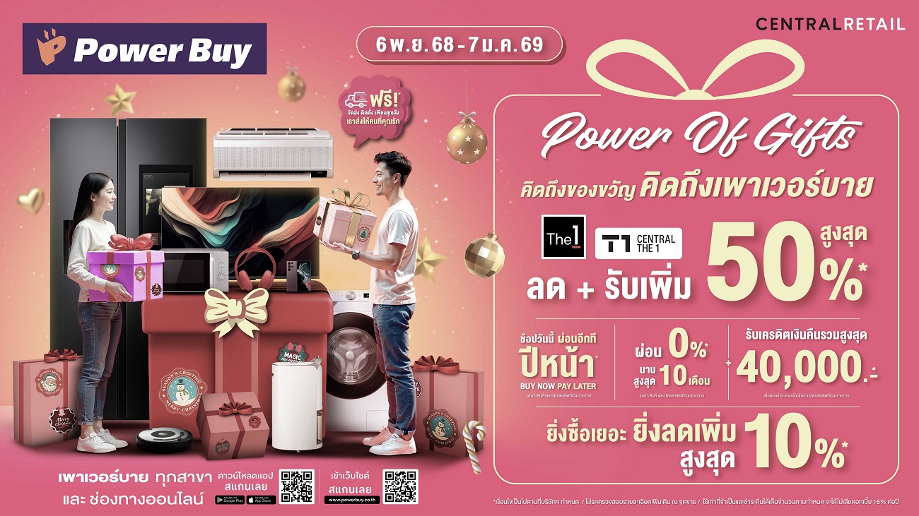 เพาเวอร์บาย ร่วมมอบความสุขตลอดเทศกาลปีใหม่นี้ด้วยแคมเปญ “Power of Gift” ยกระดับประสบการณ์ช้อปปิ้งที่สะดวกสบายและครบทุกความต้องการ ผ่านทุกช่องทาง Omnichannel ลูกค้าสามารถเลือกสรรของขวัญสุดพิเศษ ตั้งแต่วันนี้ – 7 มกราคม 2569 ที่เพาเวอร์บายทุกสาขาทั่วประเทศ รวมถึงช่องทางออนไลน์ครบวงจร ไม่ว่าจะเป็นเว็บไซต์ www.powerbuy.co.th, แอป Power Buy, Call & Shop 1324 กด 2, Line @powerbuy และ Facebook Official