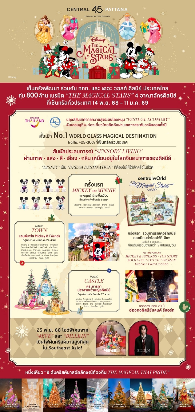 บริษัท เซ็นทรัลพัฒนา จำกัด (มหาชน) ผู้นำอันดับหนึ่งอสังหาริมทรัพย์ไทยเพื่อความยั่งยืน และผู้พัฒนาศูนย์การค้าเซ็นทรัลทั่วประเทศ จับมือ การท่องเที่ยวแห่งประเทศไทย (ททท.) และ เดอะ วอลท์ ดิสนีย์ ประเทศไทย ทุ่มงบกว่า 800 ล้านบาท สร้างปรากฏการณ์แห่งความสุขระดับโลกส่งท้ายปีในแคมเปญ The Magical Stars” เนรมิต 4 อาณาจักรเทพนิยายธีมดิสนีย์ ได้แก่ ต้นคริสต์มาสอัตลักษณ์ และ “มิคกี้และมินนี่” สูง 3 เมตร ในชุดผ้าไทย, Disney The Magical Stars 2026 at centralwOrld, Magic Town ธีมมิคกี้ เมาส์ และ Magic Castle ธีมปราสาทเจ้าหญิงดิสนีย์ เพื่อร่วมขับเคลื่อนเศรษฐกิจและการท่องเที่ยวไทยช่วงปลายปี ผ่านแนวคิด Festival Economy ปลุกบรรยากาศท่องเที่ยวให้คึกคัก เชื่อมโยงความสุขจากศูนย์การค้าเซ็นทรัลทั่วประเทศ