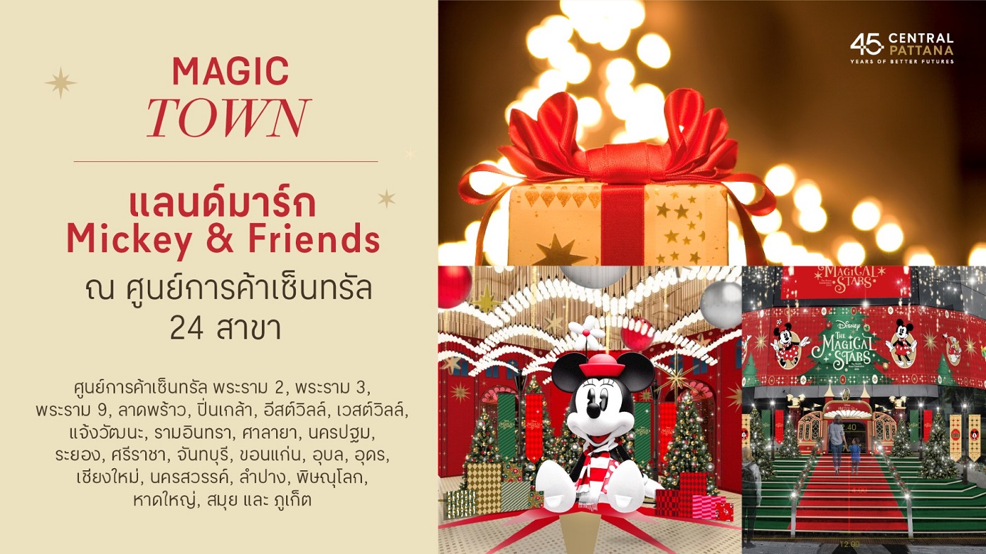 มอบความสุขให้แฟน ๆ มิคกี้ เมาส์, มินนี่ เมาส์, โดนัลด์ ดั๊ก, เดซี่, กูฟฟี่ ทั่วประเทศ ภายใต้ธีม “Magic Town” ผ่านการตกแต่ง Mickey & Friends สุดน่ารักและมีเอกลักษณ์เฉพาะในแต่ละศูนย์ฯ พาทุกคนไปถ่ายรูปกับแลนด์มาร์กสุดประทับใจ อาทิ Mickey & Minnie Giant Inflatable สุดตระการตา, Mickey & Minnie Giant Plush Dolls สูง 3 เมตร และแลนด์มาร์ก Mickey Head Shape ที่เซ็นทรัล 24 สาขา ได้แก่ พระราม 2, พระราม 3, พระราม 9, ลาดพร้าว, ปิ่นเกล้า, อีสต์วิลล์, เวสต์วิลล์, แจ้งวัฒนะ, รามอินทรา, ศาลายา, นครปฐม, ระยอง, ศรีราชา, จันทบุรี, ขอนแก่น, อุบล, อุดร, เชียงใหม่, นครสวรรค์, ลำปาง, พิษณุโลก, หาดใหญ่, สมุย และ ภูเก็ต