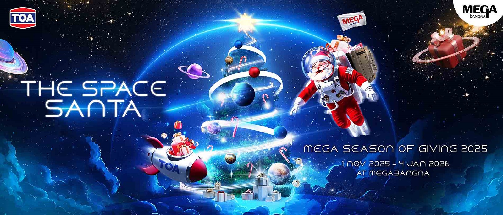 ศูนย์การค้าเมกาบางนา แหล่งช้อปปิ้งที่ใหญ่ที่สุดแห่งกรุงเทพฯ ฝั่งตะวันออก พร้อมเติมเต็มประสบการณ์ชีวิตที่ดีในทุกๆ วัน ด้วยแนวคิด YOUR EVERYDAY MEETING PLACE ร่วมกับ TOA ชวนทุกท่านส่งต่อความสุขในช่วงเทศกาลแห่งการให้ด้วยแลนด์มาร์กสุดพิเศษ “THE SPACE SANTA” ภายใต้แคมเปญ MEGA SEASON OF GIVING 2025 ที่ถ่ายทอดแนวคิด “THE GIFT FROM GALAXY” เรื่องราวของซานตาคลอสผู้เดินทางข้ามจักรวาลเพื่อตามหาของขวัญ เพื่อมามอบรอยยิ้มพร้อมประสบการณ์สุดมหัศจรรย์ให้กับทุกคนที่เมกาบางนา ผ่านงานออกแบบ สุดล้ำที่ผสานจินตนาการของโลกอวกาศเข้ากับความอบอุ่นของเทศกาลคริสต์มาสอย่างลงตัว ทั้งต้นคริสต์มาส ขนาดยักษ์ ประดับไฟและของขวัญจากกาแล็กซี ยานอวกาศสุดล้ำจำลองการเดินทางสู่จักรวาล และอุโมงค์แสง LED บนพื้นที่กว่า 1,200 ตารางเมตร ชวนให้ทุกคนในครอบครัวมาร่วมถ่ายภาพส่งต่อความประทับใจกันตลอดปลายปีนี้ บริเวณโซนเมน เอนทรานซ์ และโซนฟู้ดวอล์ค พลาซ่า ตั้งแต่วันนี้ – 4 มกราคม 2569 ณ ศูนย์การค้าเมกาบางนา