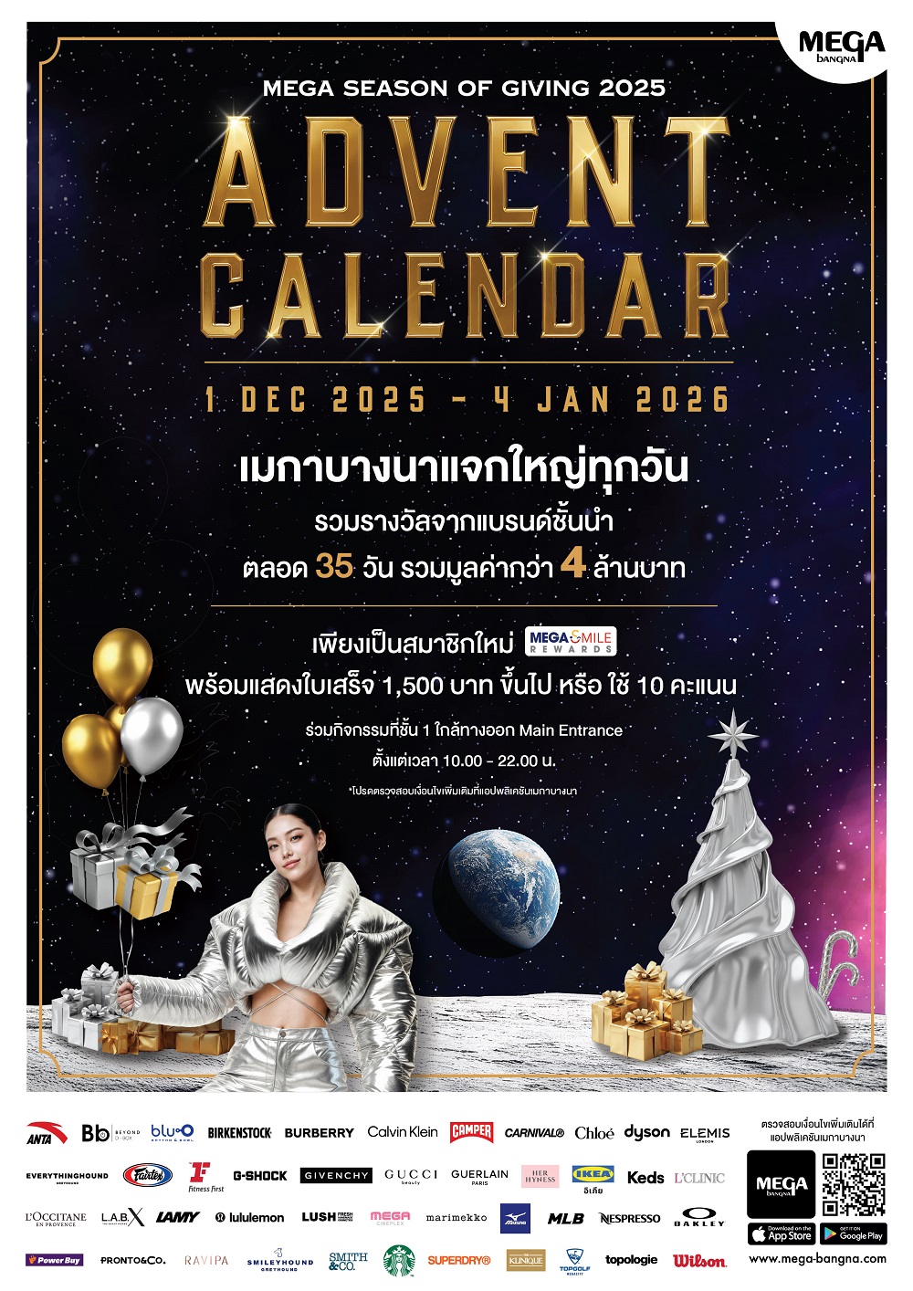 เมกาบางนาแจกรางวัลใหญ่ทุกวัน จัดเต็มแคมเปญพิเศษส่งท้ายปี “MEGA SEASON OF GIVING 2025: ADVENT CALENDAR” รวมรางวัลจากแบรนด์ชั้นนำ ตลอด 35 วัน รวมมูลค่ากว่า 4 ล้านบาท ระหว่างวันที่ 1 ธ.ค. 68 – 4 ม.ค. 69