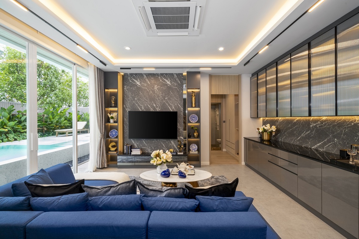 ขณะที่การตกแต่งภายใน จะเน้นการสร้างแนวคิดการอยู่อาศัยที่ชูถึงความเป็นOasis of Living ผลงานการดีไซน์ของ Interior Vision กับการตกแต่งบ้าน Type S (SUNSHINE) มาใช้เป็นแนวคิดหลักของการตกแต่งที่ต้องการจะสื่อให้สัมผัสถึงความเป็น “ถ้ำแห่งความสงบ” ที่นำสีความเป็นธรรมชาติจากในถ้ำอย่าง Larvikite เข้ามาเป็นแรงบันดาลใจในการตกแต่ง ที่ต้องการสื่อให้รู้สึกถึงความโมเดิร์น เรียบ เท่ มีความเป็นตัวเอง ผ่านการออกแบบพื้นที่ใช้สอย รวมถึงการเลือกเฟอร์นิเจอร์และของตกแต่งที่นำมาใช้ในแต่ละพื้นที่ของบ้าน