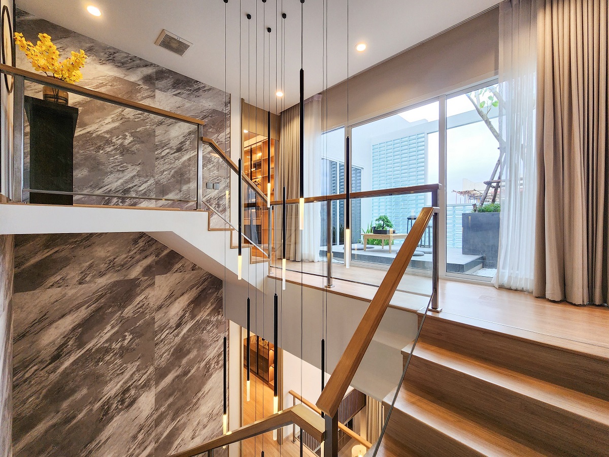 เริ่มจากชั้น 1 เมื่อผลักบานประตูเข้ามา สิ่งแรกที่สัมผัสได้คือความเรียบร้อยนุ่มนวลของโถงทางเข้าพื้นที่เล็กๆ ทำหน้าที่เป็น Buffer Zone ที่จัดจังหวะชีวิตให้เป็นระเบียบก่อนก้าวสู่พื้นที่หลักของบ้าน มีตู้เก็บรองเท้าขนาดใหญ่ซ่อนตัวอยู่ เดินเข้ามาด้านในจะสัมผัสถึงDouble Space ซึ่งเป็นเสมือนลมหายใจที่ปล่อยให้ความโปร่งโล่งได้ทำงาน และพื้นที่เพดานแนวตั้งยังช่วยสร้างมิติที่ทำให้บ้านดูใหญ่ขึ้น มีการเลือกใช้เฟอร์นิเจอร์แบบ Built-in ที่ถูกฝังแนบไปกับผนังอย่างเนี๊ยบเพื่อเป็นการลดรอยต่อของสายตา เพื่อเปิดพื้นที่ให้กว้างอย่างไร้ความวุ่นวาย มีการเลือกเฉดสีของเฟอร์นิเจอร์เทาเข้ม ดำ เพื่อสื่อให้สัมผัสถึงความรู้สึกนิ่ง สงบ และมีระดับ เพราะความหรูหราในแบบ LPN ไม่ใช่ความฟู่ฟ่า แต่คือความเท่ที่นิ่ง ลุ่มลึก หนักแน่นและทรงพลัง ภายในบ้านยังมีการดีไซน์มุมพักผ่อนเพื่อให้ทุกคนในครอบครัวได้ใกล้ชิดธรรมชาติ หรือจะปรับให้เป็นมุมสังสรรค์กับครอบครัว เพื่อนสนิทที่แวะเวียนมา สามารถเดินเชื่อมต่อมายังห้องรับแขก และห้องครัว ที่มีการวางแปลนให้สามารถเชื่อมต่อไปยังส่วน Dining และ Living โดยมีการกันกระจกเพื่อปิดกั้นเสียงรบกวนจากการทำอาหาร รวมถึงกลิ่นที่อาจจะเข้ามารบกวนสมาชิกที่อยู่ในโซนอื่นๆ ด้วย