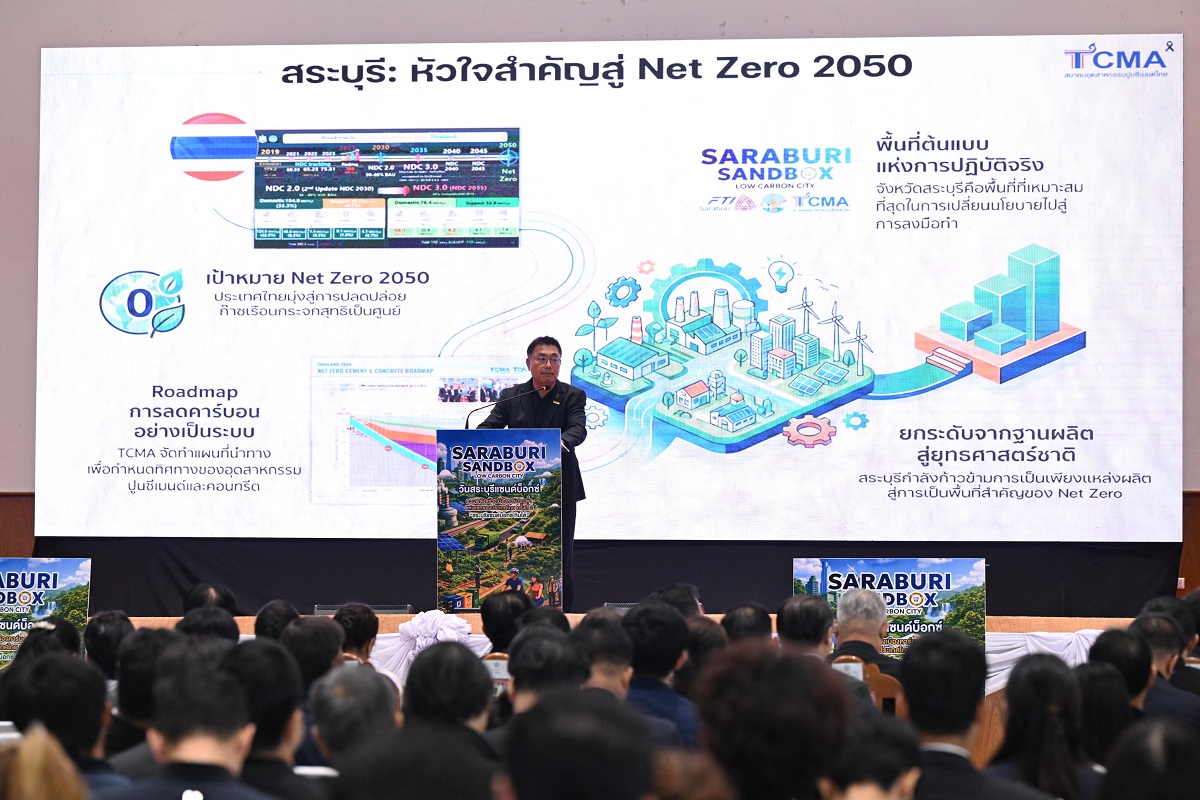 ดร.ชนะ ภูมี นายกสมาคมอุตสาหกรรมปูนซีเมนต์ไทย (TCMA) เปิดเผยว่า “สระบุรีแซนด์บ็อกซ์” เป็นโครงการต้นแบบเมืองคาร์บอนต่ำแห่งแรกของไทย ที่เริ่มต้นจากความร่วมมือระหว่างภาครัฐ ภาคเอกชน และภาคประชาสังคม ภายใต้แนวคิด Public–Private–People Partnership (PPP) ตั้งแต่ปี 2566 และสามารถต่อยอดสู่ผลลัพธ์เชิงรูปธรรมในหลายมิติ ทั้งการเปลี่ยนผ่านสู่พลังงานสะอาดและยั่งยืน การขับเคลื่อนอุตสาหกรรมสีเขียวและผลิตภัณฑ์ที่เป็นมิตรต่อสิ่งแวดล้อม การจัดการของเสียให้เกิดมูลค่า การส่งเสริมเกษตรคาร์บอนต่ำ ตลอดจนการเพิ่มพื้นที่สีเขียวในจังหวัดสระบุรี