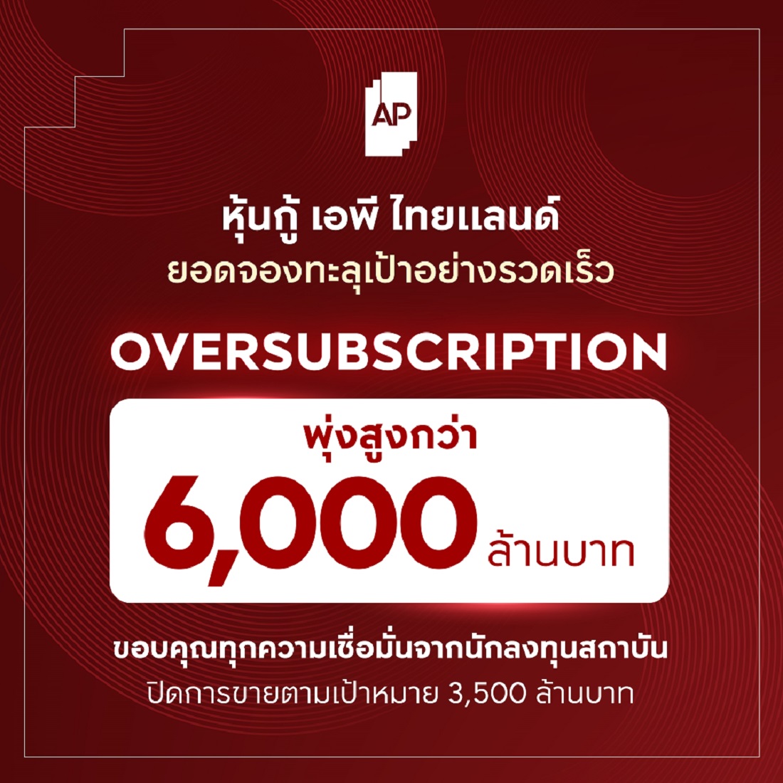เอพี ไทยแลนด์ โชว์แกร่งรับต้นปี 2569 ปิดจองหุ้นกู้ Oversubscription ทะลุ 6,000 ล้านบาท สะท้อนนักลงทุนสถาบันเชื่อมั่นแข็งแกร่ง