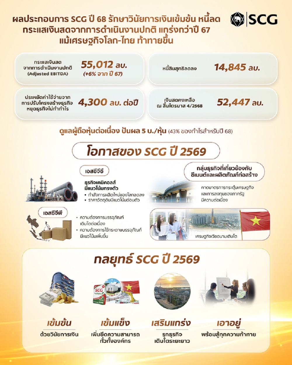 ผลประกอบการเอสซีจีปี 68 รักษาวินัยการเงินเข้มข้น กระแสเงินสดจากการดำเนินงานปกติ ที่ไม่รวมรายการพิเศษ (Adjusted EBITDA) 55,012 ล้านบาท แข็งแกร่งกว่าปี 67 คิดเป็น 6% ขณะที่หนี้ลดลง 14,845 ล้านบาทจากปีก่อน แม้เศรษฐกิจโลกและไทยท้าทายขึ้น ชี้ผลการปรับโครงสร้างธุรกิจ หยุดธุรกิจไม่ทำกำไร และประหยัดค่าใช้จ่าย ได้รวมกว่า 4,300 ล้านบาทต่อปี พร้อมเคาะปันผล 5.0 บาท/หุ้น ดูแลผู้ถือหุ้นต่อเนื่อง ปี 2569 ธุรกิจเคมิคอลส์มีแนวโน้มทรงตัว เนื่องจากกำลังการผลิตใหม่ของโลกลดลง และราคาวัตถุดิบมีแนวโน้มอ่อนตัว เอสซีจีจึงเดินหน้าเข้มข้น ด้วยวินัยการเงิน – เข้มแข็ง เพิ่มขีดความสามารถทั่วองค์กร – เสริมแกร่ง รุกธุรกิจเติบโตระยะยาว มุ่งกลยุทธ์ Regional Optimization ชูเวียดนาม เป็นฐานผลิตรับตลาดในประเทศและส่งออกตลาดโลก พร้อมดันสินค้า SVP – HVA และ Green ที่แนวโน้มเติบโตสูง – เอาอยู่ พร้อมสู้ทุกความท้าทาย