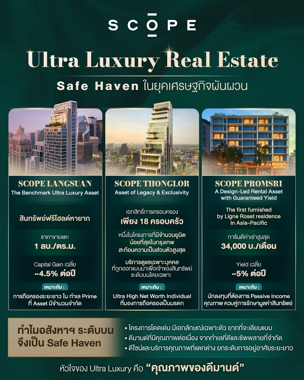 ในภาวะที่การลงทุนต้องอาศัยความแม่นยำมากกว่าการคาดหวัง ทั้ง 3 โครงการของสโคป หลังสวน ทองหล่อ และพร้อมศรี สะท้อนแนวคิดเดียวกันว่า Ultra Luxury ที่แท้จริงไม่จำเป็นต้องขายให้ทุกคน แต่ต้องรักษาคุณค่าให้กับผู้ที่เลือก สโคปไม่พัฒนาโครงการเกินศักยภาพของทำเล และไม่มุ่งผลตอบแทนระยะสั้น หากแต่ลงทุนกับทำเลหายาก งานออกแบบระดับโลก และระบบ Hospitality ที่สร้างดีมานด์คุณภาพอย่างต่อเนื่อง จึงทำให้อสังหาริมทรัพย์ของสโคปสามารถรักษามูลค่าได้อย่างมั่นคง และในบางโครงการยังกล้าการันตีผลตอบแทนอย่างเป็นรูปธรรม นี่จึงไม่ใช่เพียงการเลือกที่อยู่อาศัย แต่คือการเลือก กลยุทธ์การลงทุนระยะยาว สำหรับพอร์ตที่ต้องการความมั่นคงในวันที่โลกการเงินไม่แน่นอน