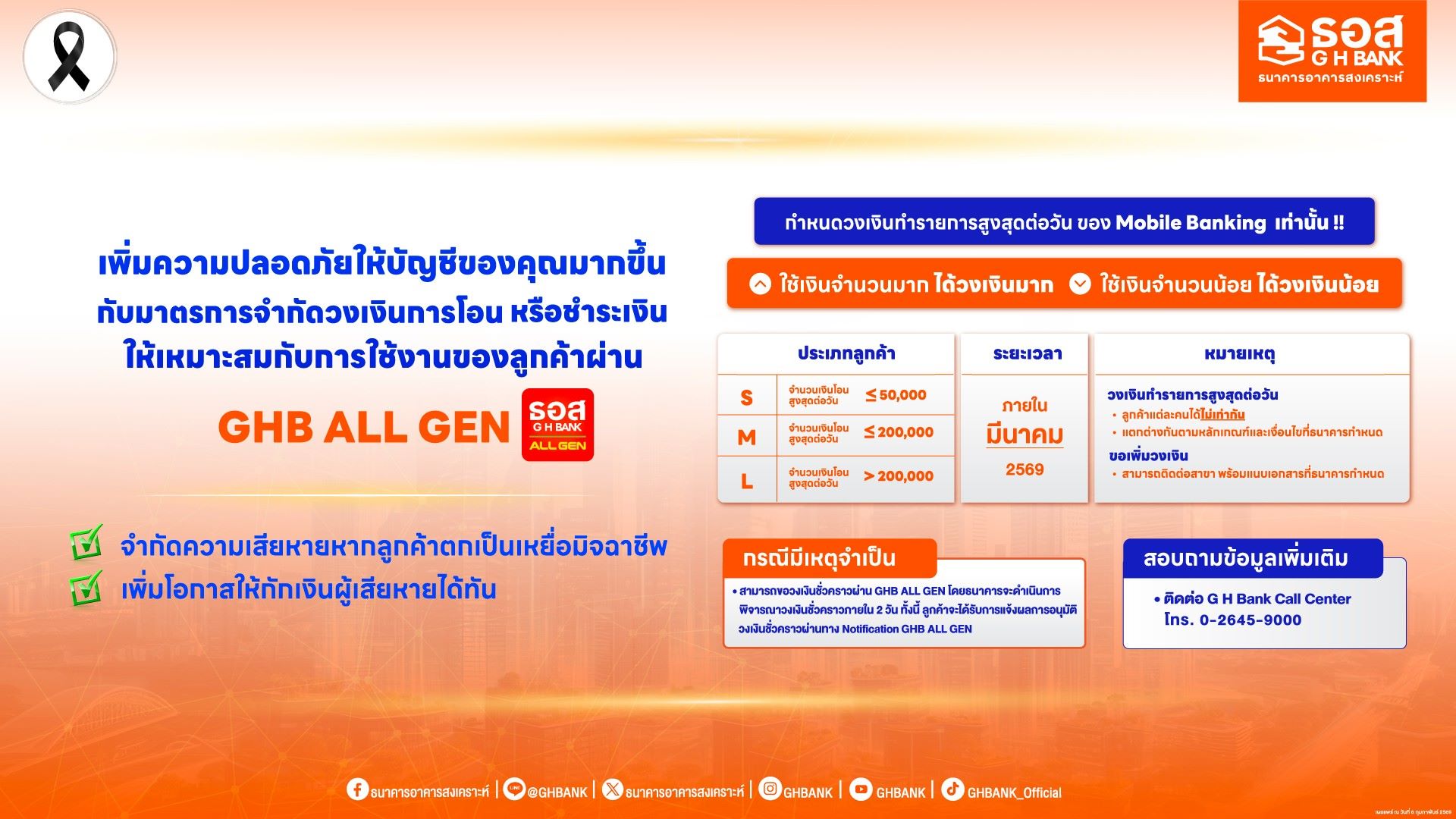 โอนหรือชำระเงินตั้งแต่ 200,000 บาทต่อวันขึ้นไป โดยจะมีผลในเดือนมีนาคม 2569 เป็นต้นไป ทั้งนี้ ลูกค้าที่มีความจำเป็นสามารถขอปรับเพิ่มวงเงินการโอนหรือชำระเงินเป็นการชั่วคราวได้ด้วยตนเองผ่านแอปพลิเคชัน GHB ALL GEN เพื่อความสะดวกในการใช้งาน สอบถามรายละเอียดเพิ่มเติมได้ที่ G H Bank Call Center โทร 0-2645-9000 และติดตามข่าวสารของธนาคารได้ที่ G H Bank Social Media ทุกช่องทาง