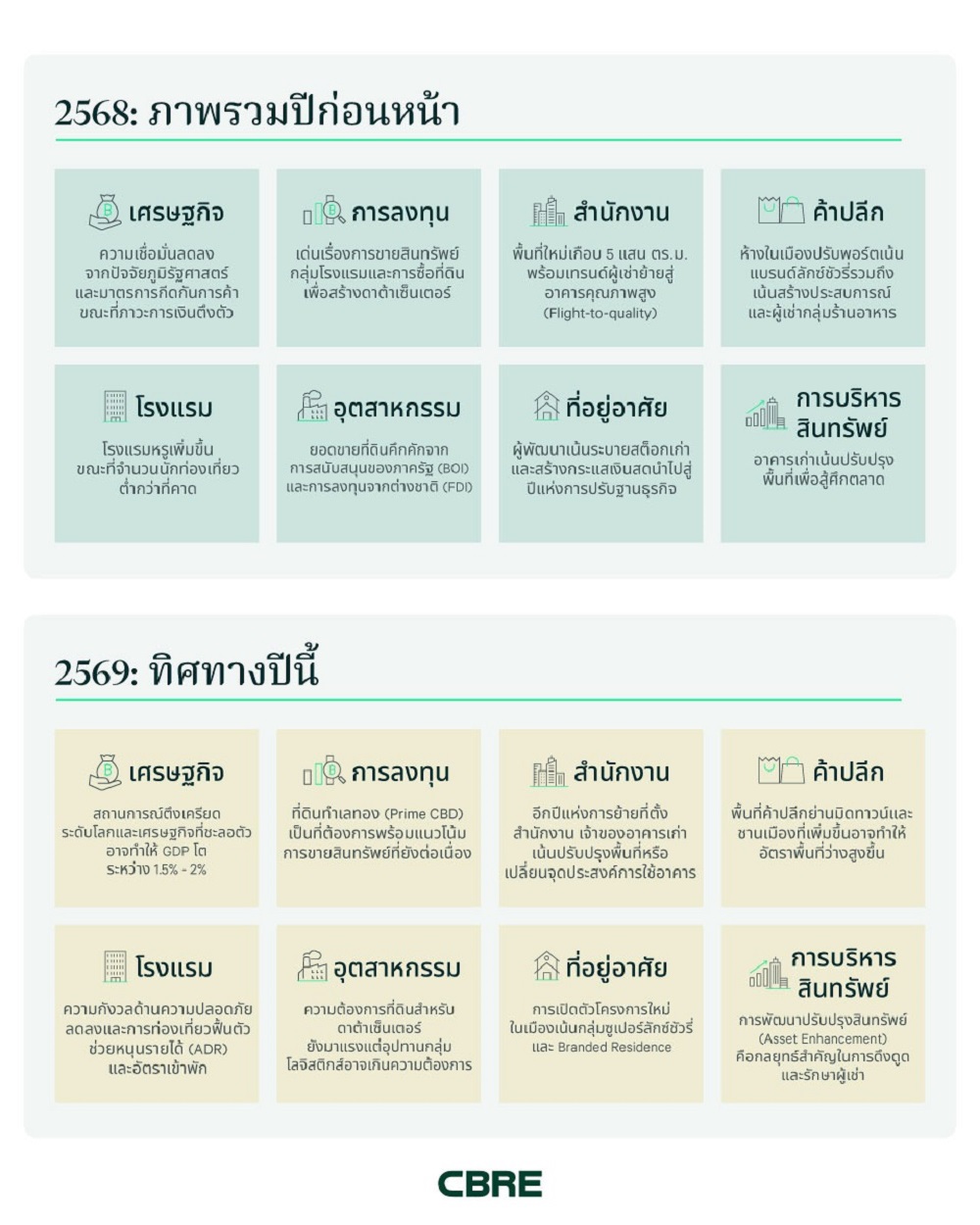 “ตลาดอสังหาริมทรัพย์ของไทยยังคงเปลี่ยนแปลงไปอย่างต่อเนื่อง ซึ่งหมายถึงผู้พัฒนาอสังหาริมทรัพย์ต้องวางแผนอย่างมีกลยุทธ์และมีความคล่องตัวในการลงทุนและพัฒนา” นางสาวรุ่งรัตน์ วีระภาคย์การุณ กรรมการผู้จัดการ ซีบีอาร์อี ประเทศไทย กล่าว “บทวิเคราะห์ของเราชี้ให้เห็นว่า แม้บางภาคธุรกิจจะยังคงเผชิญแรงกดดัน แต่บางภาคธุรกิจอยู่ในตำแหน่งที่พร้อมเติบโตได้อย่างแข็งแกร่ง โดยมีปัจจัยหนุนจากการปรับเปลี่ยนพฤติกรรมของผู้บริโภค มาตรการกระตุ้นจากภาครัฐ และทิศทางความเปลี่ยนแปลงระดับโลก ดังนั้น การปรับตัวและสร้างสรรค์สิ่งใหม่ ๆ จึงเป็นกุญแจสำคัญสู่ความสำเร็จ”