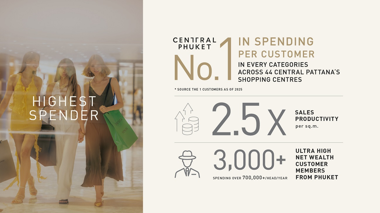 กลุ่มเซ็นทรัล บริหาร Luxury retail ในกว่า 18 ประเทศ 140 เมืองทั่วโลก และเป็นหนึ่งใน Global Strategic Partner ของเครือแบรนด์หรูระดับโลก มียอดขายมูลค่ามหาศาลต่อปี ย้ำความเชื่อมั่นให้แบรนด์ระดับโลกยังคงเลือกเติบโตกับเราอย่างต่อเนื่อง โดยจากศักยภาพของภูเก็ตและความเชื่อมั่นที่แบรนด์มีต่อเซ็นทรัล ภูเก็ต ซึ่งพิสูจน์ได้จากยอดขายที่เติบโตต่อเนื่อง และหลายแบรนด์มียอดขายเป็นอันดับ 1 ของประเทศที่นี่ ทำให้แบรนด์ระดับโลกตัดสินใจขยายพื้นที่ร้าน พร้อมพัฒนาคอนเซ็ปต์ใหม่ในระดับแฟล็กชิป รวมถึง Phuket Exclusive items ที่มีเฉพาะที่เซ็นทรัล ภูเก็ต เท่านั้น ด้วยศักยภาพต่างๆ นี้ เราจึงเดินหน้าขยาย Luxury zone เพิ่มอีกเท่าตัว และเพิ่มจำนวนแบรนด์ลักชูรี่ต่อเนื่อง โดยภายในปี 2028 จะขยายสเกลเทียบเท่ากรุงเทพฯ ทำให้เซ็นทรัล ภูเก็ต เป็นศูนย์การค้าหนึ่งเดียวนอกกรุงเทพฯ ที่รวมแบรนด์ลักชูรี่ระดับต้นๆ ของโลกไว้เกือบครบที่สุด