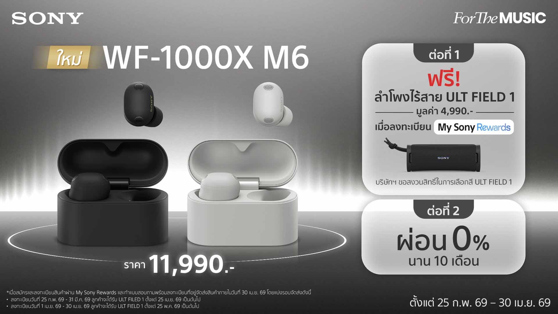 WF-1000XM6 พร้อมวางจำหน่ายแล้ววันนี้ ในราคา 11,990 บาท โดยมีให้เลือกทั้งหมด 2 สี ได้แก่ สีดำ (Black) และสีแพลตตินัมซิลเวอร์ (Platinum Silver) พร้อมโปรโมชั่นพิเศษ รับฟรีลำโพงพกพาโซนี่ ULT FIELD 1 มูลค่า 4,990 บาท เมื่อซื้อหูฟัง WF-1000XM6 และลงทะเบียนรับประกันสินค้า My Sony ผ่านไลน์ @SonyThai พร้อมตอบแบบสอบถามที่จะได้รับทางอีเมลหลังการลงทะเบียนรับประกันสินค้าภายในวันเดียวกัน ตั้งแต่วันที่ 25 กุมภาพันธ์ 2569 – 30 เมษายน 2569