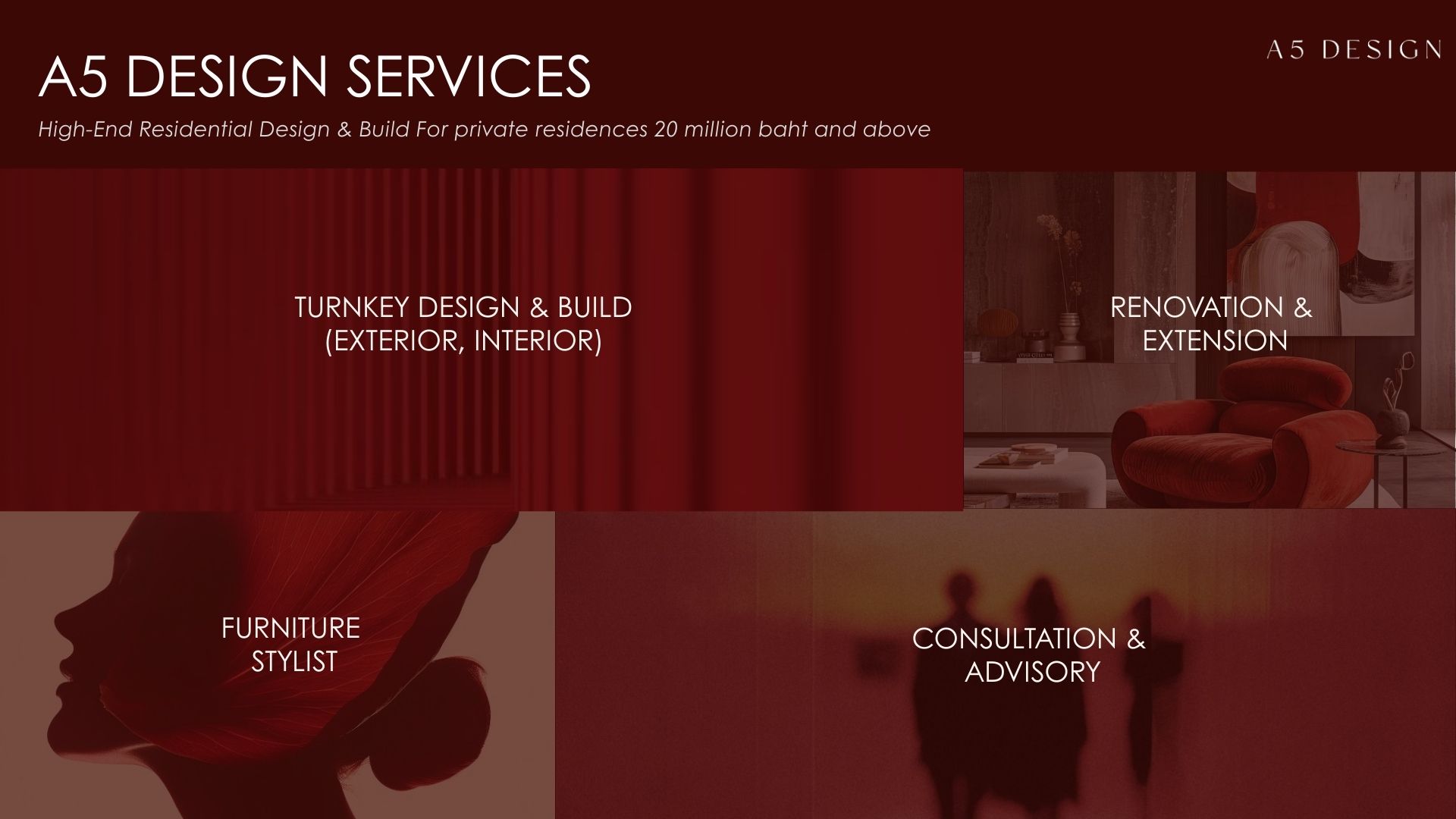 A5 Design ไม่เพียงรองรับงานออกแบบและก่อสร้างสำหรับโครงการภายในกลุ่มบริษัทเท่านั้น แต่ยังขยายบริการไปสู่ลูกค้าภายนอก เพื่อตอบรับความต้องการของตลาดบ้านระดับลักชัวรีที่เติบโตอย่างต่อเนื่อง และถือเป็นอีกหนึ่งธุรกิจสำคัญที่จะช่วยเสริมความแข็งแกร่งให้กับบริษัทในระยะยาว