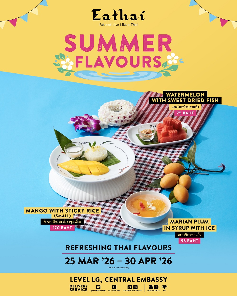 เติมเต็มความสนุกด้วยความอร่อย ความสดชื่นพร้อมบรรยากาศสนุกที่ Eathai ชั้น LG เสริมสิริมงคลด้วย กิจกรรม สรงน้ำพระ วันที่ 10 – 15 เมษายน 2569 เติมเต็มความสนุกโดย Live DJ TukTuk Radio วันที่ 12 – 13 เมษายน 2569 เวลา 12.00 – 14.00 น. และ 17.00 – 19.00 น. สดชื่นรับหน้าร้อนกับ Summer Flavours เสิร์ฟเมนูไทยคลายร้อนสุดพิเศษ อย่างแตงโมหน้าปลาแห้ง ข้าวเหนียวมะม่วง และมะยงชิดลอยแก้ว ตลอดเดือน และพลาดไม่ได้กับความอร่อยสุดเอ็กซ์คลูซีฟ เพียงสั่งอาหารและเครื่องดื่มครบ 400 บาทต่อใบเสร็จ รับฟรี! ขนมชั้นลายผ้าไทย ที่สะท้อนเอกลักษณ์วัฒนธรรมไทย (จำนวนจำกัด 60 สิทธิ์) วันที่ 12 – 14 เมษายน 2569