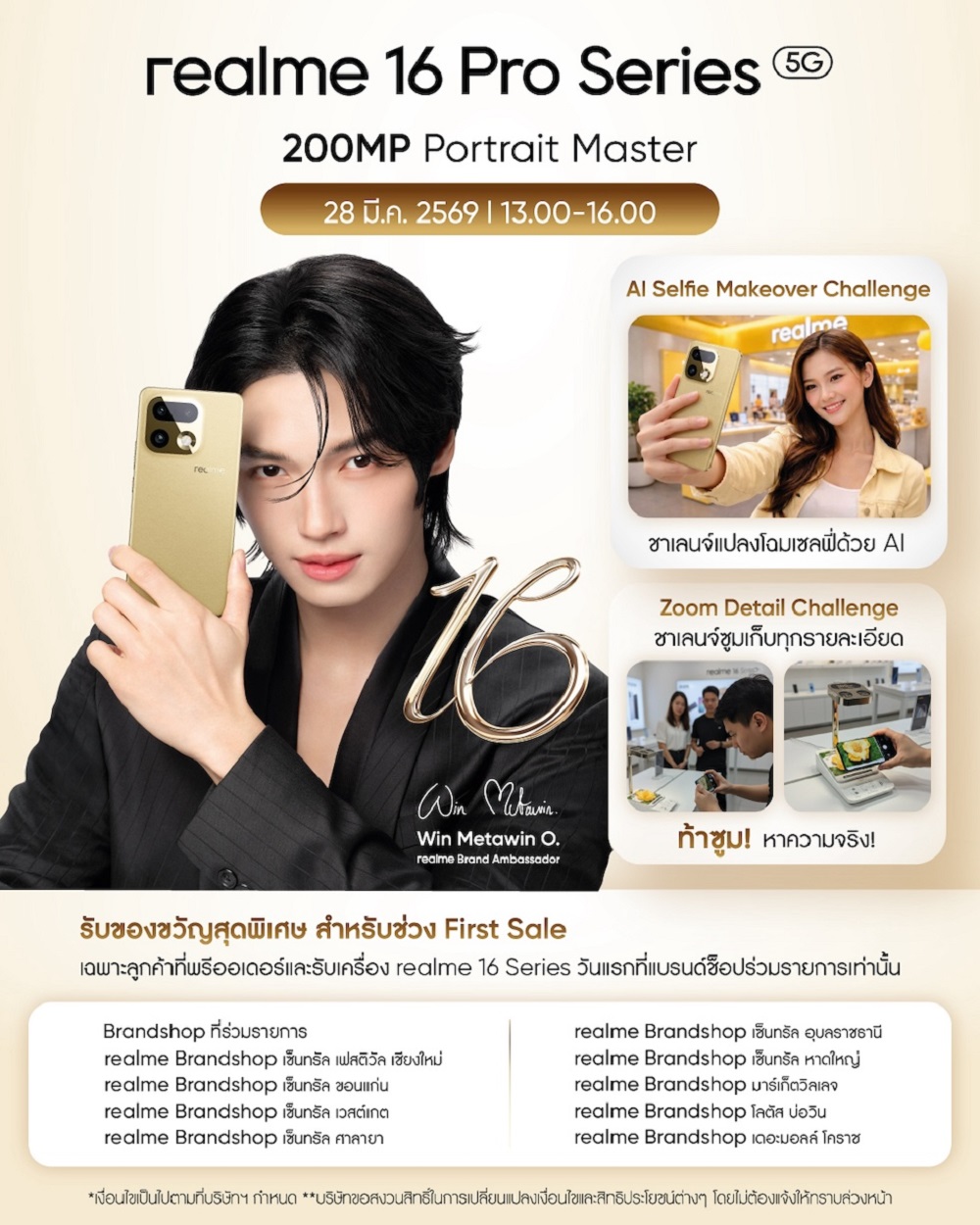 นอกจากนี้ realme ยังเตรียมกิจกรรมพิเศษต้อนรับวันแรกของการวางจำหน่าย realme 16 Pro Series 5G อย่างยิ่งใหญ่ realme Brand Shop หลากหลายสาขาทั่วประเทศ อาทิ realme Brandshop ศูนย์การค้า เซ็นทรัล เฟสติวัล เชียงใหม่, realme Brandshop เซ็นทรัล ขอนแก่น, realme Brandshop เซ็นทรัล เวสต์เกต, realme Brandshop เซ็นทรัล ศาลายา, realme Brandshop เซ็นทรัล อุบลราชธานี, realme Brandshop เซ็นทรัล หาดใหญ่, realme Brandshop มาร์เก็ตวิลเลจ, realme Brandshop โลตัส บ่อวิน และ realme Brandshop เดอะมอลล์ โคราช โดยภายในงานพบกับ 2 กิจกรรมไฮไลต์สุดสนุก ได้แก่ “AI Selfie Makeover Challenge” ชาเลนจ์แปลงโฉมเซลฟี่ด้วยพลัง AI และ “Zoom Detail Challenge” ท้าซูมพิสูจน์ความคมชัด เก็บทุกรายละเอียด เพื่อให้แฟน ๆ ได้สัมผัสประสบการณ์กล้องสุดล้ำของ realme 16 Pro Series 5G อย่างใกล้ชิดตั้งแต่วันแรกที่วางจำหน่าย
