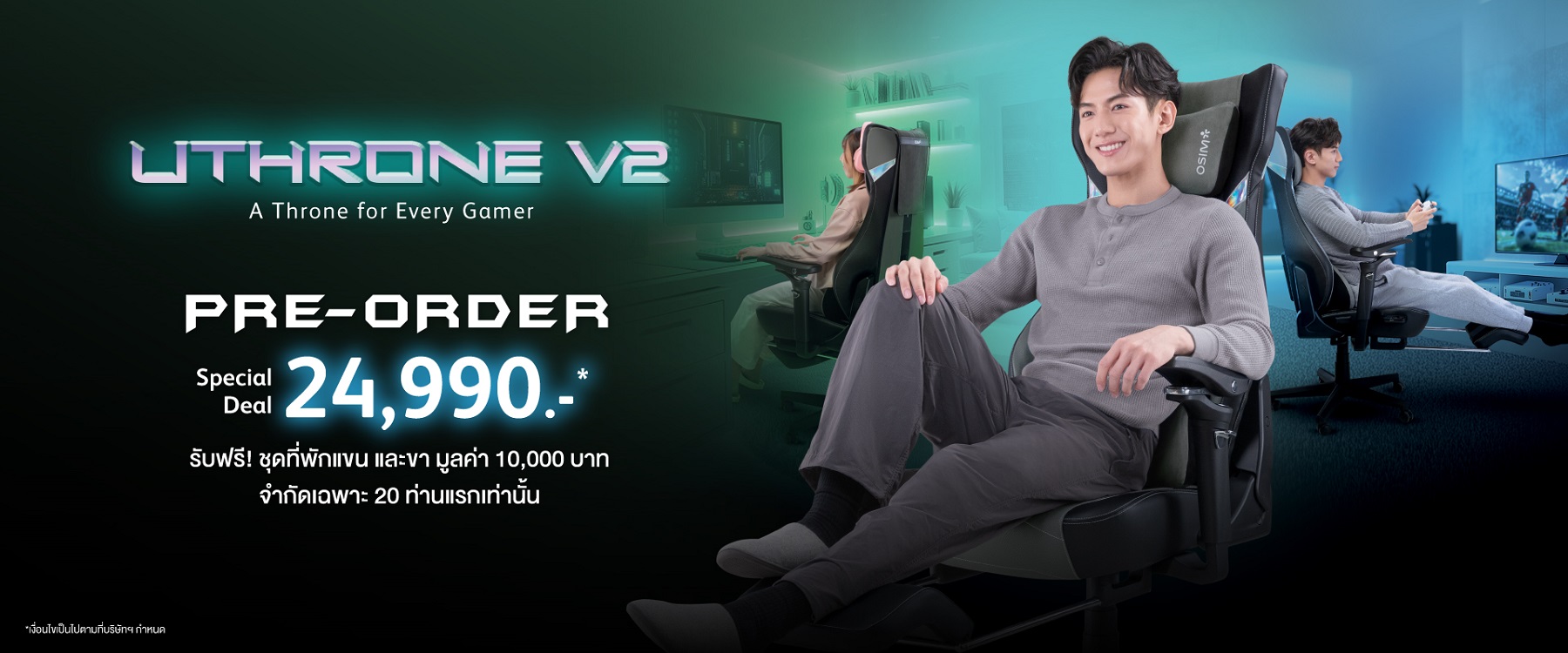 หลังจากสร้างกระแสตอบรับอย่างล้นหลามจากการเปิดตัวบนเวทีการแข่งขันอีสปอร์ต OSIM เดินหน้าต่อยอดความสนใจดังกล่าว ด้วยการเปิดให้ผู้บริโภคได้เป็นเจ้าของ uThrone V2 อย่างเป็นทางการผ่านข้อเสนอพิเศษแบบสั่งจองล่วงหน้า (Pre-Order) ในราคาเริ่มต้นเพียง 24,990 บาท จากราคาปกติ 44,990 บาท พร้อมรับฟรี Ergo Tilt Armrest และ LoungePro Footrest มูลค่ารวมกว่า 10,000 บาท อุปกรณ์เสริมที่ช่วยเพิ่มความยืดหยุ่นและความสบายในการใช้งาน โดยมีจำนวนจำกัดสำหรับลูกค้ากลุ่มแรก เริ่มตั้งแต่วันที่ 20 – 30 เมษายน 2569 เท่านั้น