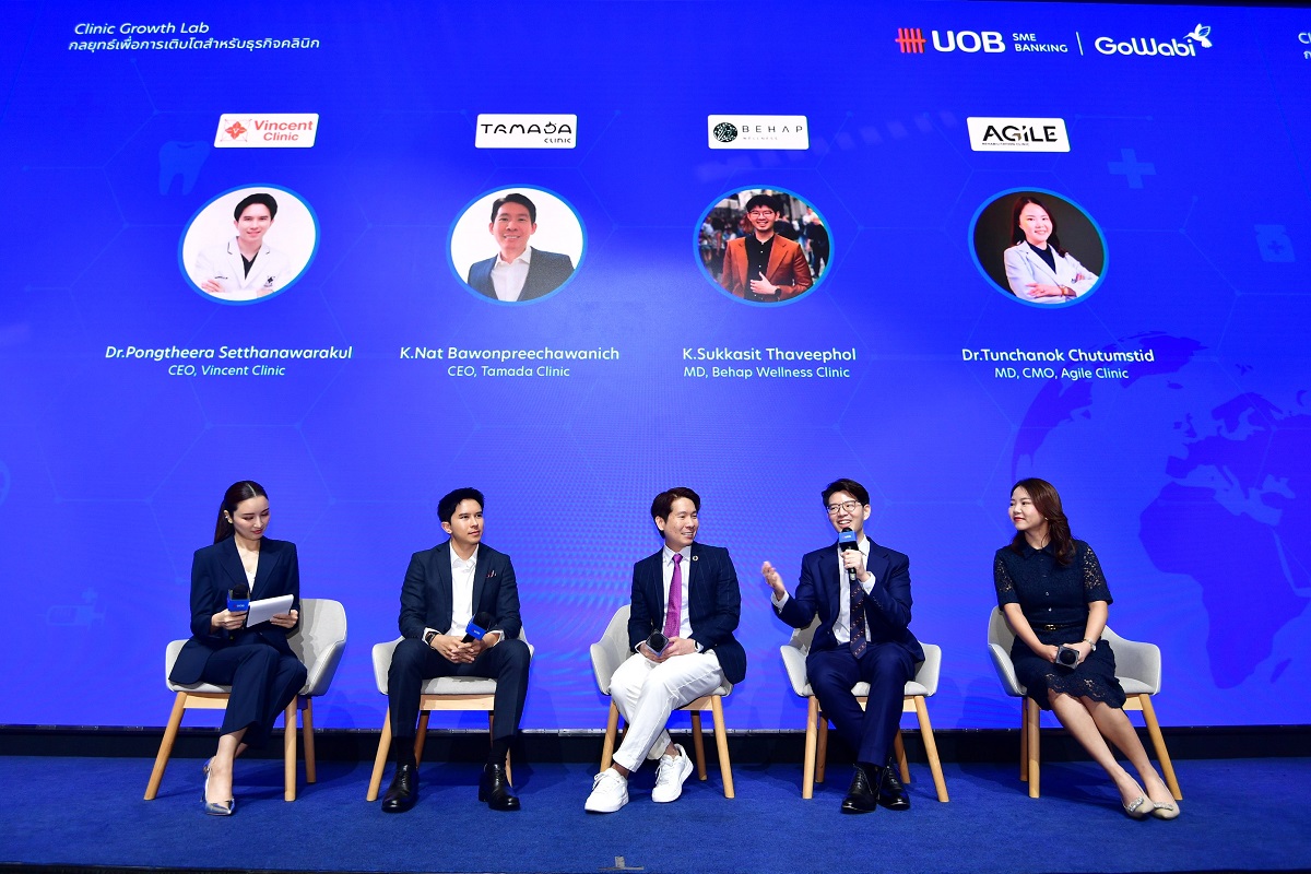(จากซ้ายไปขวา) วิภาวี วงศ์สิริศักดิ์ ประธานเจ้าหน้าที่ฝ่ายขายและผู้ก่อตั้ง GoWabi สยุมรัตน์ มาระเนตร ผู้ช่วยกรรมการผู้จัดการใหญ่ ธุรกิจเอสเอ็มอี ธนาคารยูโอบี ประเทศไทย วีระอนงค์ จิระนคร ภู่ตระกูล กรรมการผู้จัดการ Deputy CEO และ Wholesale Banking ธนาคารยูโอบี ประเทศไทย นพ.ธนวรรฒน์ โชติมา นายกสมาคมศัลยกรรมและเวชศาสตร์เพื่อการเสริมสวยประเทศไทย (TACS) และ ทันตแพทย์พิสุทธิ์ แสนมโน เลขาสมาคมทันตกรรมทั่วไปชั้นสูง (ประเทศไทย)